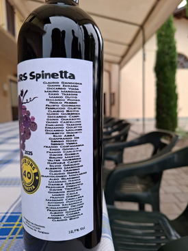 Claudio Bisio con la bottiglia di "Nebbiolo" personalizzata. Mauro Marchisio Presidente del Club Urs di Spinetta.